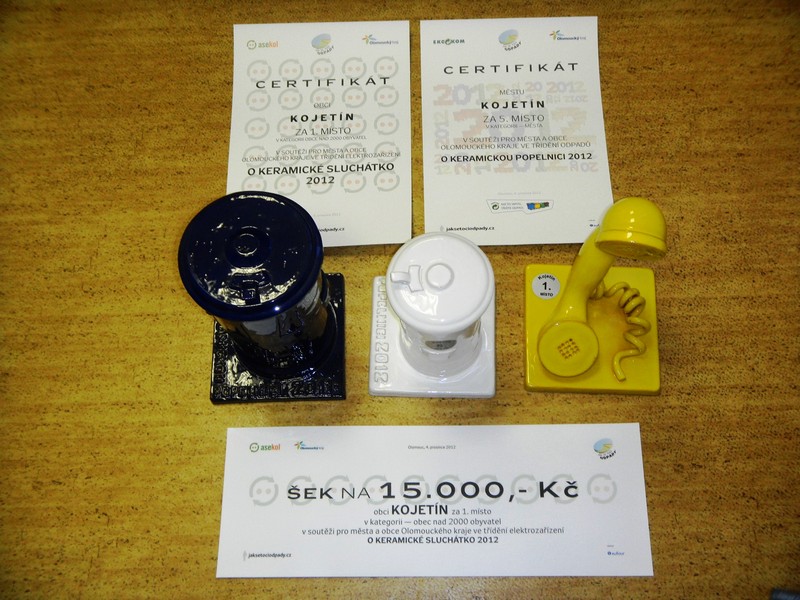 Město Kojetín díky vaší spolupráci získalo certifikát např. za 5. místo od firmy EKOKOM v kategorii města Olomouckého kraje ve třídění odpadu v roce 2012 a bylo oceněno keramickou popelničkou.